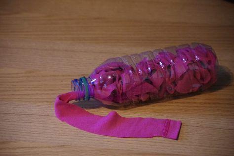 Maak een lange strook van stof of fleece en prop het in een platic fles. Zorg dat het einde uit de fles steekt. Doe wat brokjes in de fles en schudt even zodat de brokjes tussen de stof wordt verspreid. Let op dat er geen losse plastic ring meer op de fles zit.