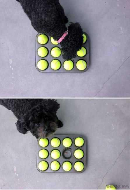 Stop een brokje in elk holletje van een cupcake vorm. Leg er een tennisbal bovenop en laat je hond lekker zoeken!