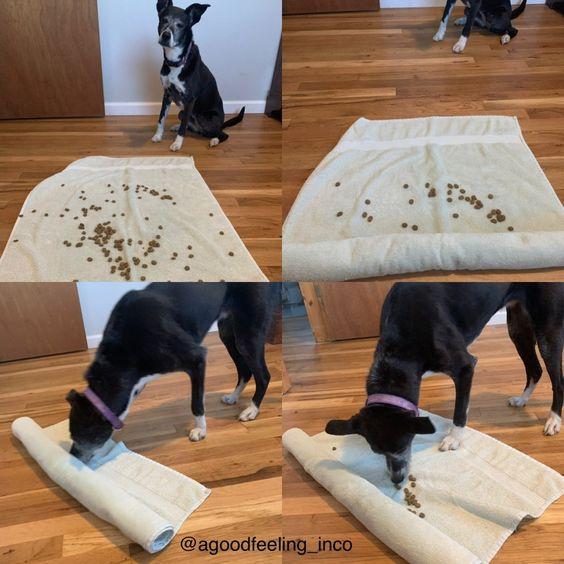 Strooi de snacks op een handdoek en rol de handdoek op. Zorg dat de ondergrond stroef is: leg de handdoek op een tapijt of gebruik een anti-slipmat zodat de handdoek door het gewroet van je hond niet steeds wegschuift. Dat is slecht voor zijn gewrichten en kan ook voor frustratie zorgen.