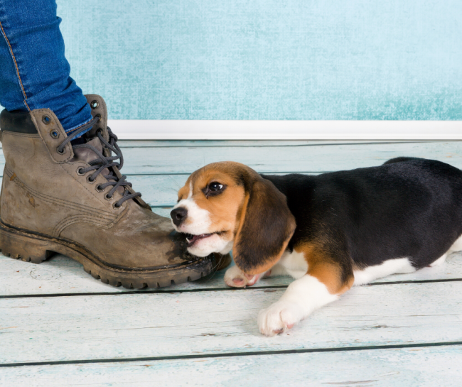 Sommige pups 'jagen' op deze manier ook op je voeten als je loopt. Het is spel! Maar als je wegloopt, maakt dit je pup alleen maar meer enthousiast. Daarom kun je beter even stil blijven staan en je puppy negeren. Gaat de pup nog steeds door met je voeten te spelen? Zet je pup dan rustig eventjes weg totdat hij gekalmeerd is. Doe dit rustig zonder straf of ophef.
